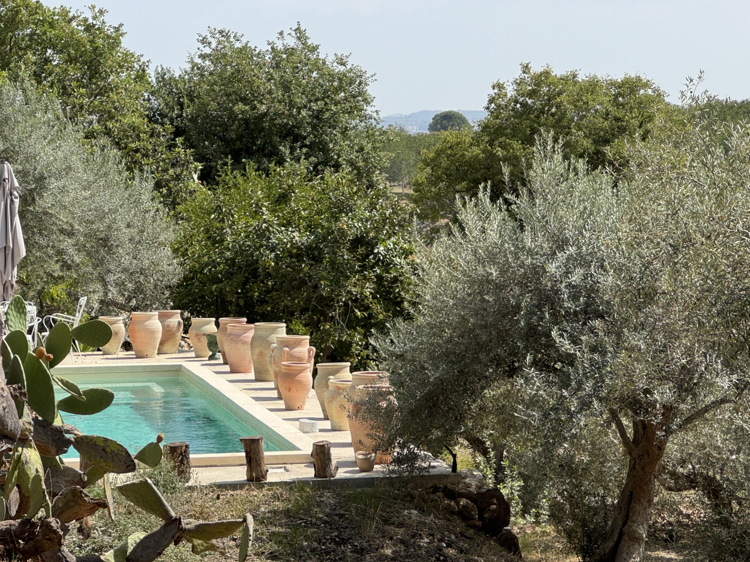 The house is at the top of a tiered olive grove, the trees spread through the bowl of the land, ramps lead down through the stone walls. Wildflowers pop up. Cuttings from the trees show that the olives are managed, it’s a very slow farm.